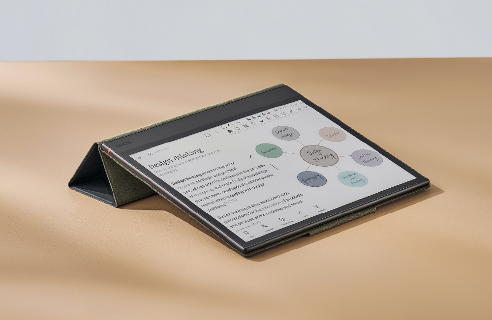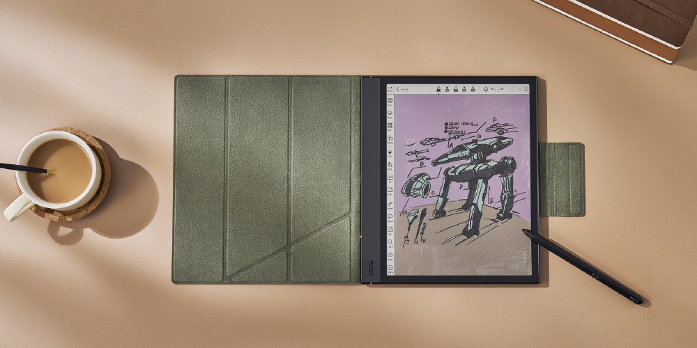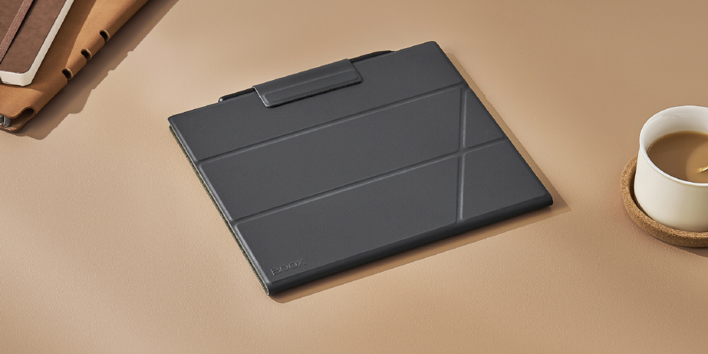 BOOX Note Air4 C専用のフリップカバーです。高級感漂うPUレザーの外装と、柔らかく滑らかな超繊維レザーの内装が特徴。