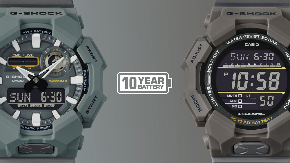 ハードな使用に耐える耐衝撃性能と、長く使える電池寿命約10年を同時に実現したGA-010、GD-010。