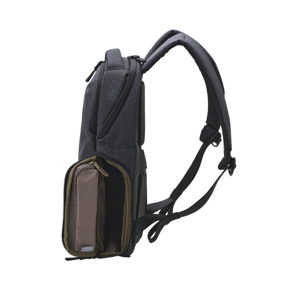背面には、バッグを降ろさずに財布の出し入れができる隠しポケットを備えています。
