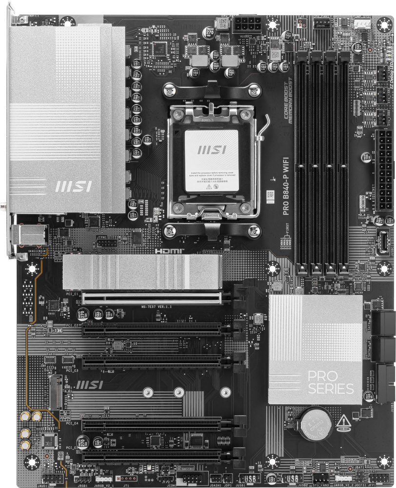 AMD B840チップセット搭載。シルバーのヒートシンクを備えシンプルなデザインを採用した、スタンダードモデルのATXマザーボード