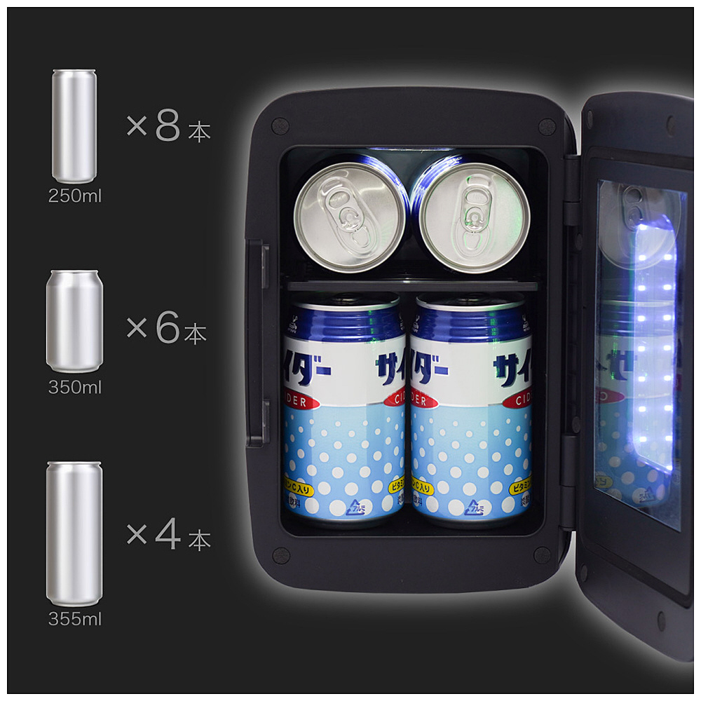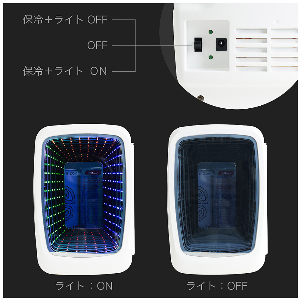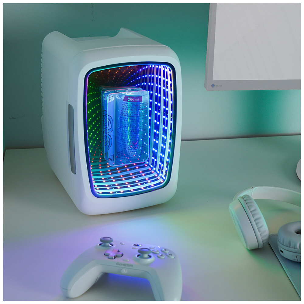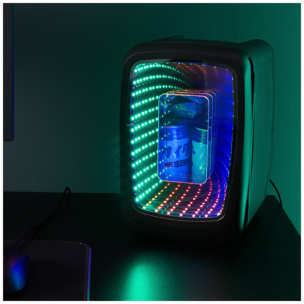 インフィニティミラーが前面にある小型の卓上4L冷蔵庫