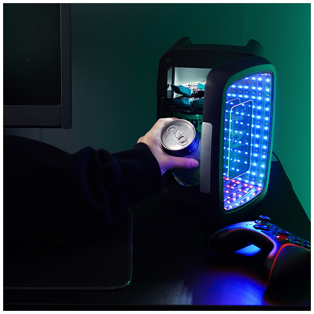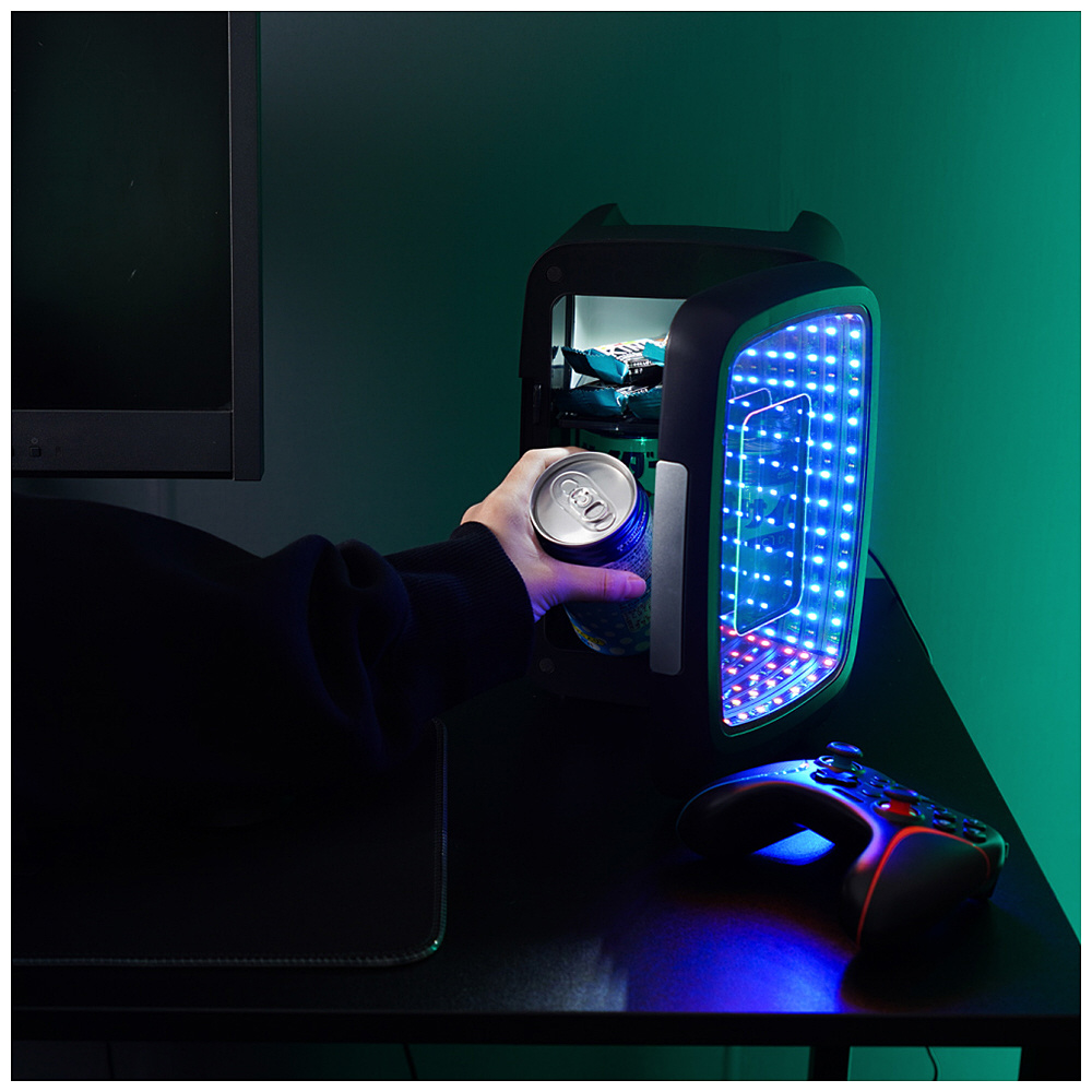 奥行きのあるインフィニティミラーのライトでデスク上を色鮮やかに演出しながらドリンクやスナックをすぐ手の届く場所で保冷しておけます。