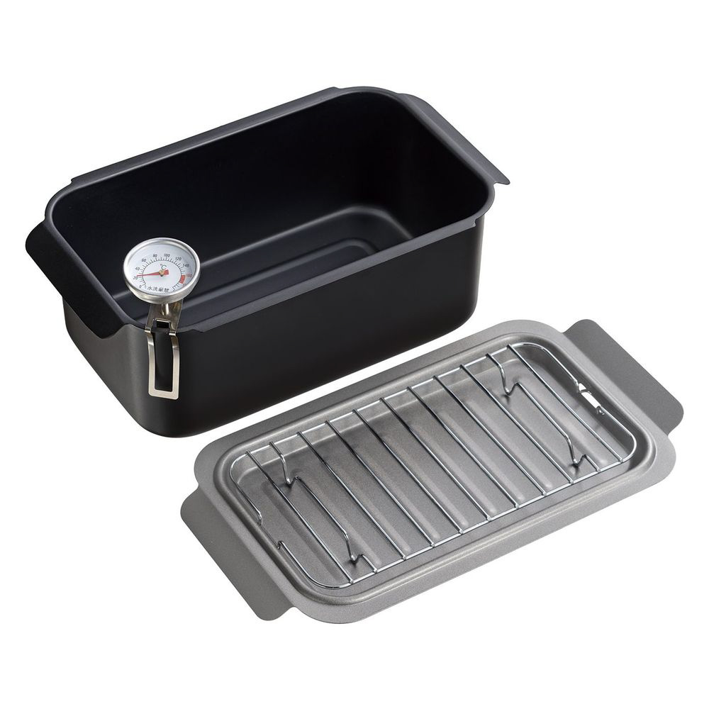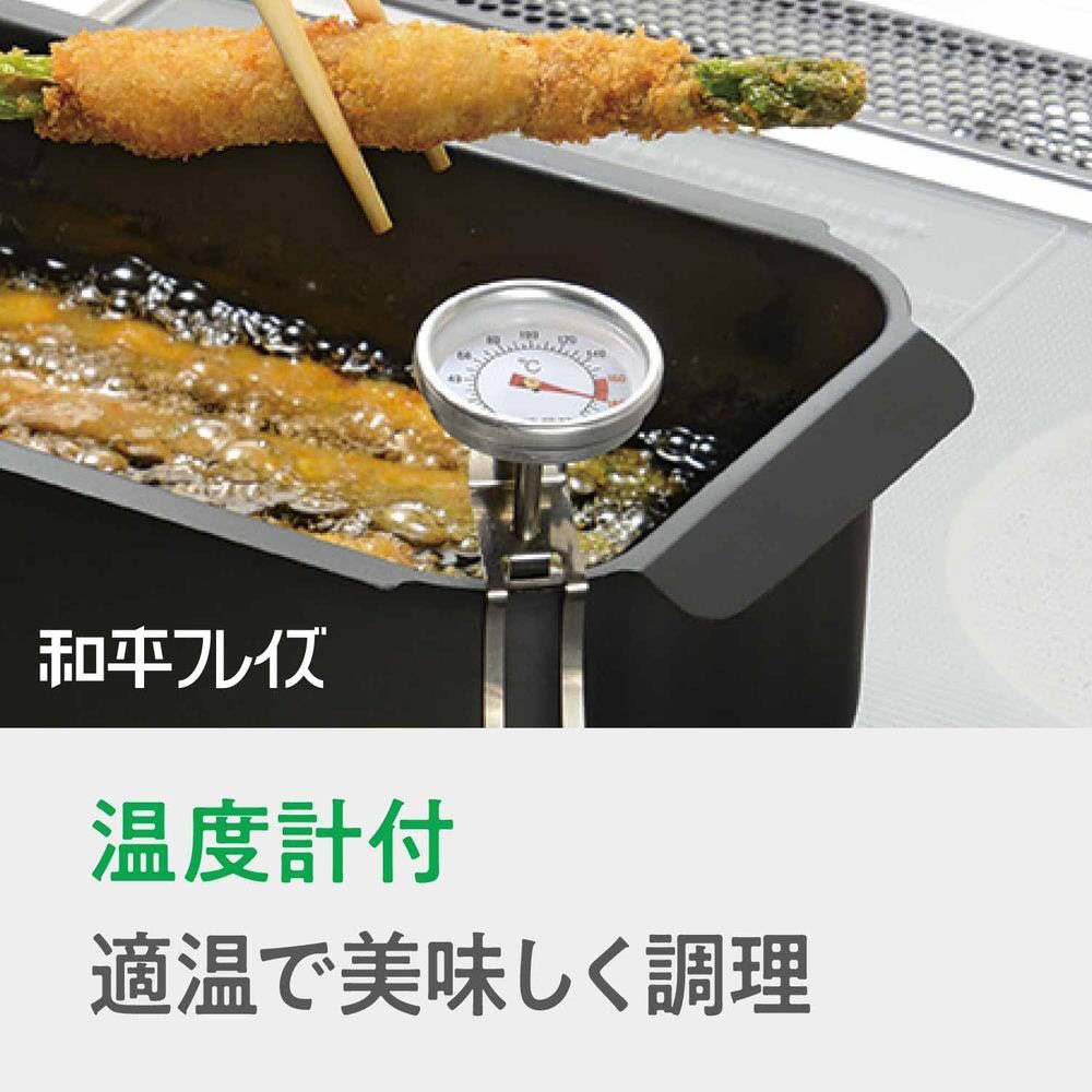少ない油で揚げられるコンパクトな角型揚げ鍋。温度計付きで揚げ温度の調整が可能。長い食材も揚げやすく、収納もスッキリ。バットは蓋にもなり、トースターで温め直しもできます。