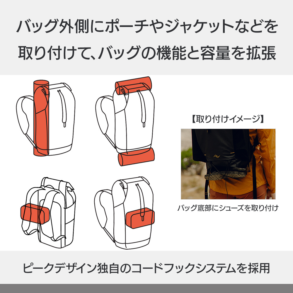 ピークデザインにより考案されたCord Hook?(コードフック)システムとCord Rails?(コードレール)を活用してさまざまなアクセサリーやポーチをバッグの外側に取り付けることにより、バッグの機能と容量を拡張します。バッグ背面や各所に配置されたCord Rails?(コードレール)による柔軟な取り付けポイントを利用し、付属の「コードフックエクスターナルキャリーコード」と「コードフックギアループ」で、バッグ外側にジャケットや寝袋などを固定できます。