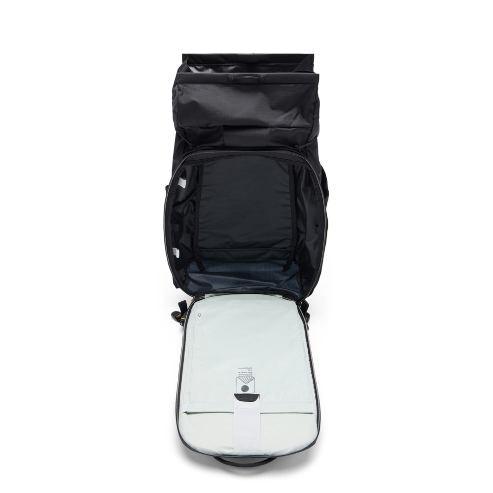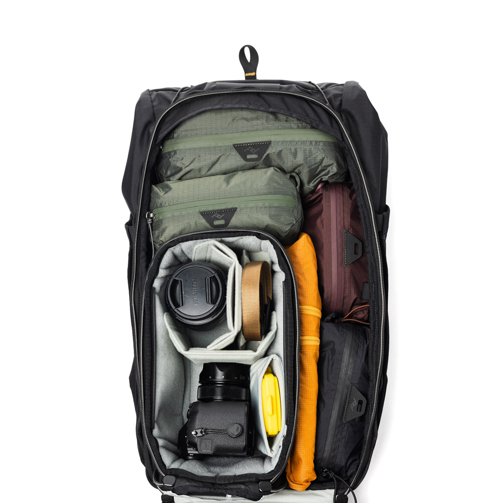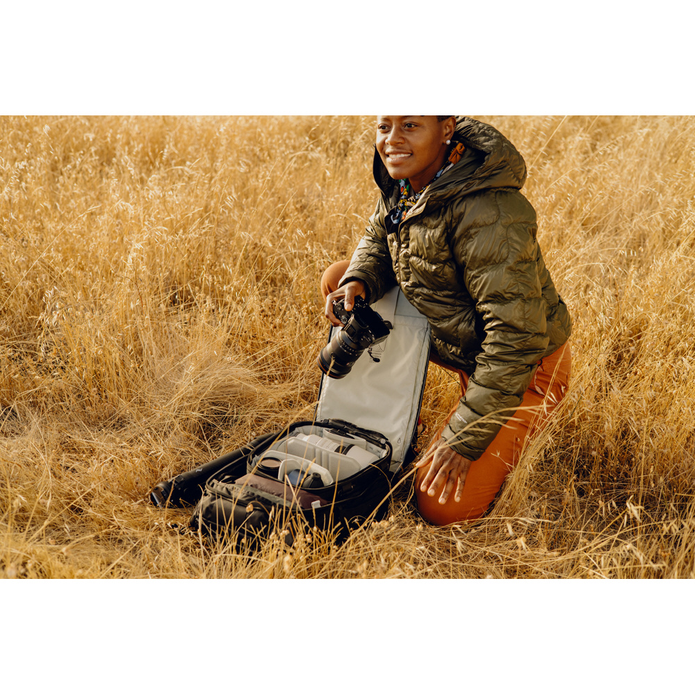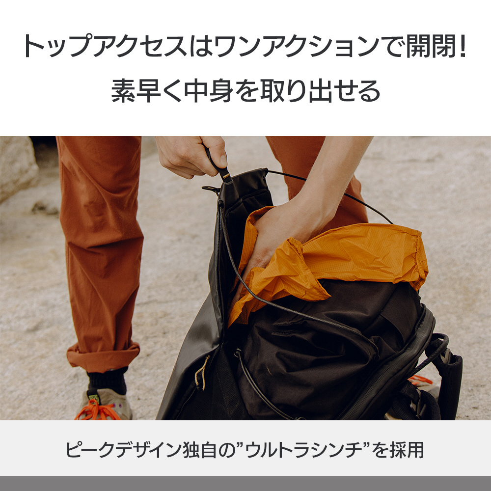 トップアクセスはワンアクションで開閉できるUltra Cinch?(ウルトラシンチ)を採用し、素早く中身を取り出せます。メインコンパートメントはバックパネルを開いて背面からのアクセスも可能で、カメラキューブと組み合わせてアウトドア向けの理想的なカメラバッグとしても使えます。