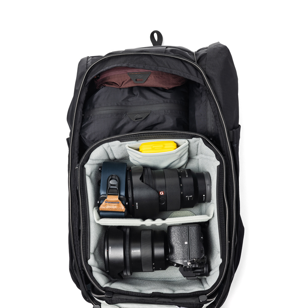 25Lサイズは、メインコンパートメントに1.5ユニットまで収納可能。機材を増やしたい時は、ロールトップ拡張スペースに、カメラキューブXスモールを収納することもできます。