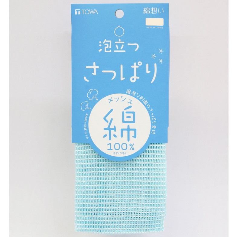 綿100%のメッシュ編みで適度な肌ざわりでさっぱりした洗い上がりのボディタオルです。メッシュが空気を含みやすいため綿素材なのに泡立ちが良いです。