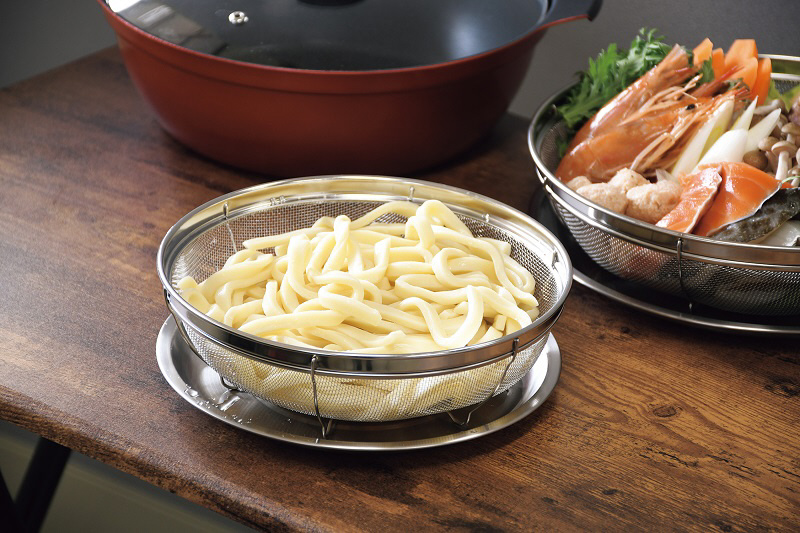 水切りしながらそのまま食卓へ鍋の具材の盛り付けにザルは傷切れが良く足付だから衛生的ザルのアミは強く押さないでください。アミの変形や外れる原因になります。鉄やアルミ等の異種金属製品と接触したまま保管しないでください。錆の原因になります。
