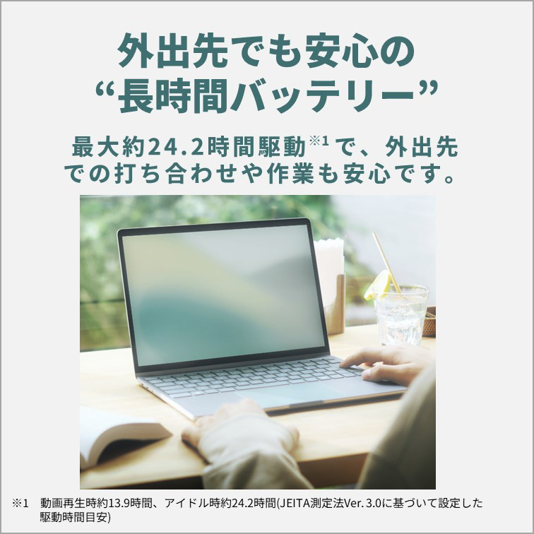 持ち運びやすいコンパクトなA4サイズだから、ノートや本と一緒にバッグに入れられます。約24時間駆動(JEITA 3.0(アイドル時)で測定)で、外出先での打ち合わせや作業も安心。