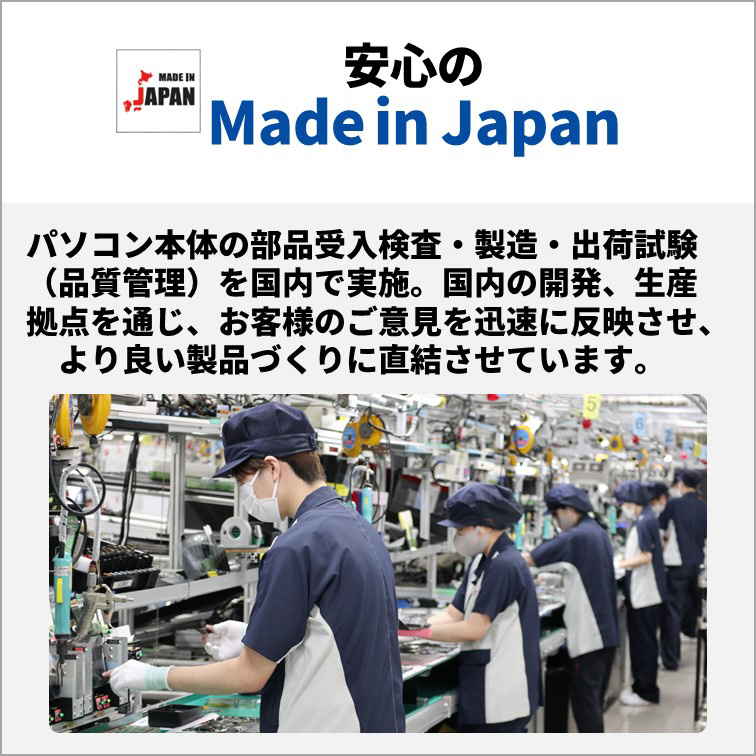 パソコン本体の部品受入検査・製造・出荷試験(品質管理)を国内で実施。国内の開発、生産拠点を通じ、お客様のご意見を迅速に反映。使いやすさの向上など、より良い製品づくりに直結させています。