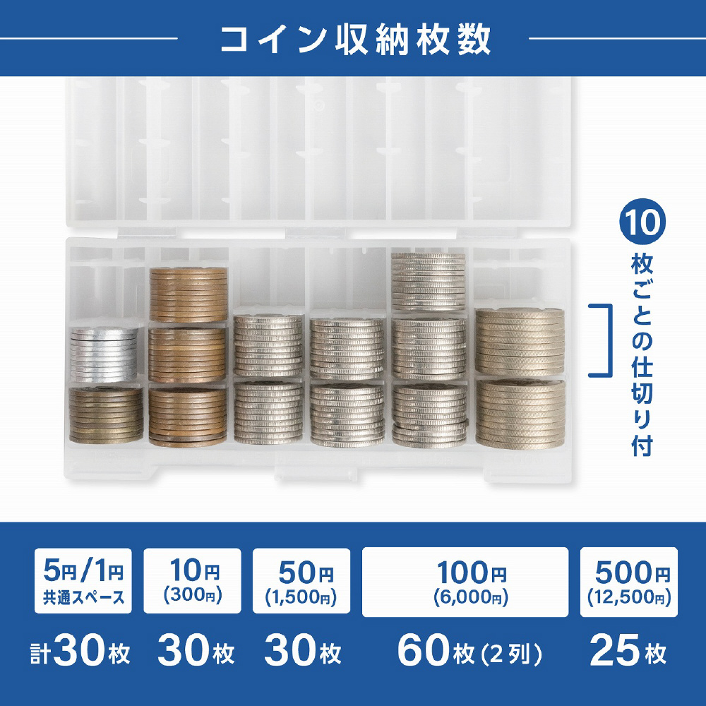 使用頻度に合わせた硬貨収納量(500円:25枚、100円:60枚、50円:30枚、10円:30枚、1円/5円:混載で30枚)となっています。