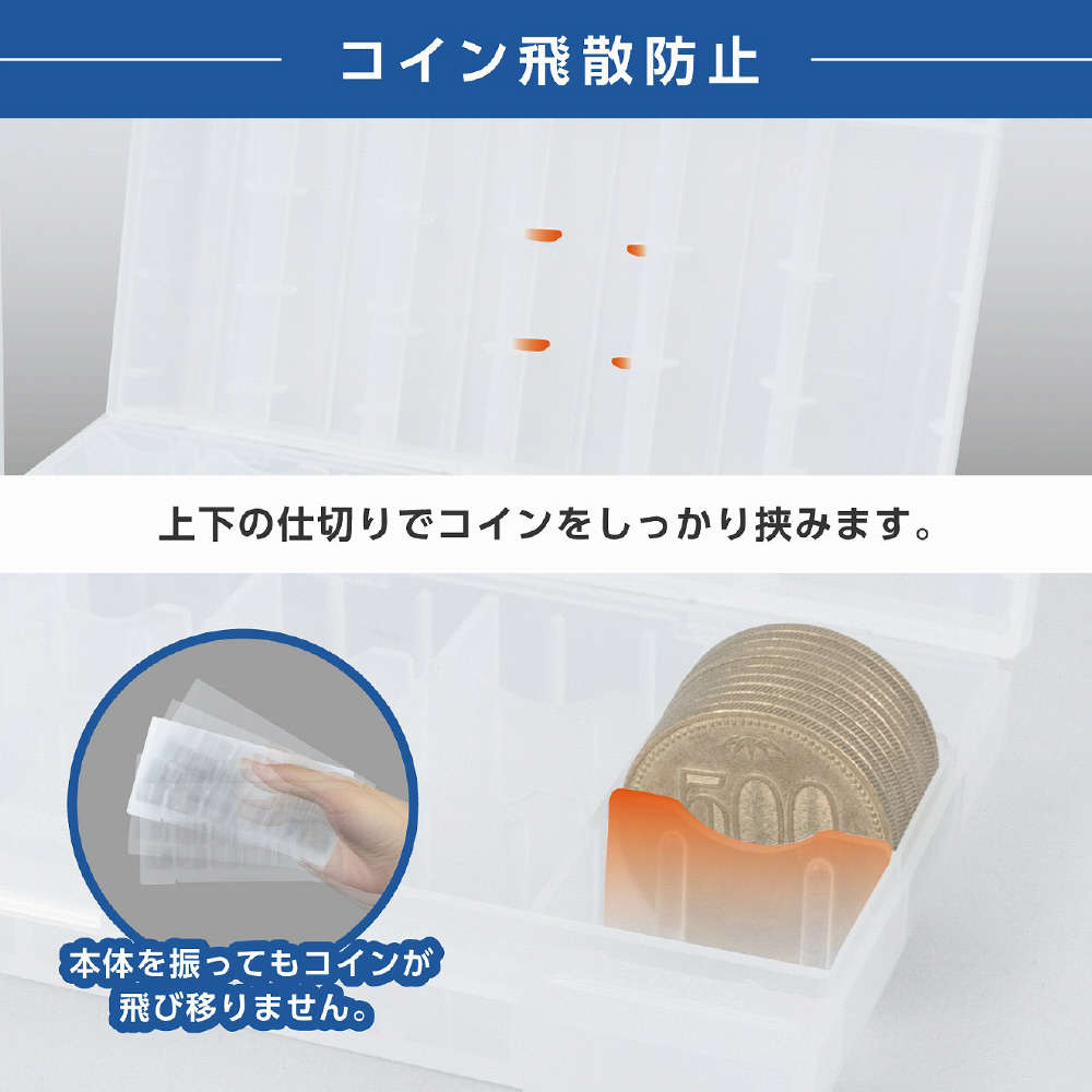 フタ側にも仕切りを付けることで、持ち運び時に生じる硬貨の飛散を防止。