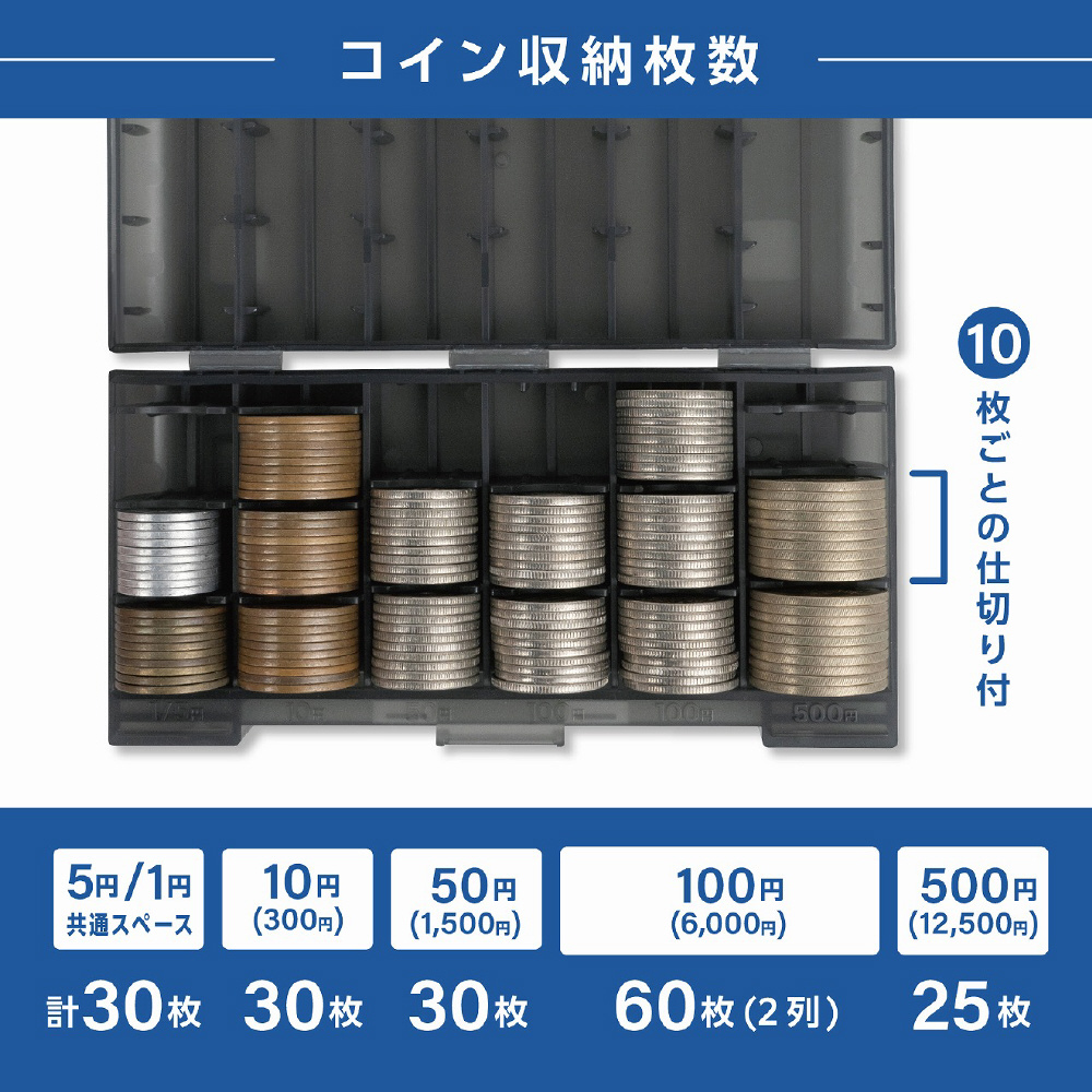 使用頻度に合わせた硬貨収納量(500円:25枚、100円:60枚、50円:30枚、10円:30枚、1円/5円:混載で30枚)となっています。