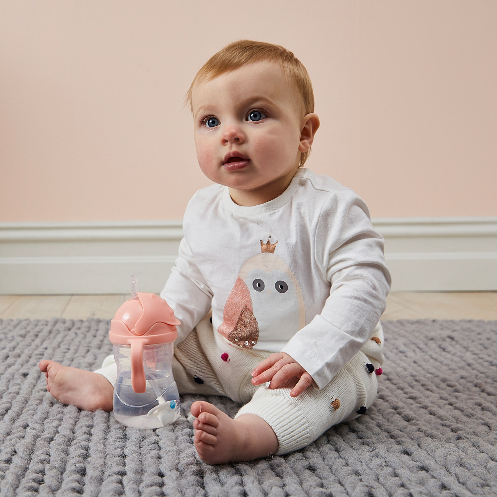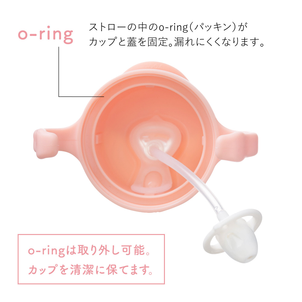 イノベイティブなおもりのついたストローを搭載することで、カップの傾きを気にせず、どんな体勢でも飲みやすい工夫がされています。寝転がった状態でも飲めるので、哺乳瓶からストローマグへの移行の練習期間や、お風呂上がりの水分補給にも便利です。