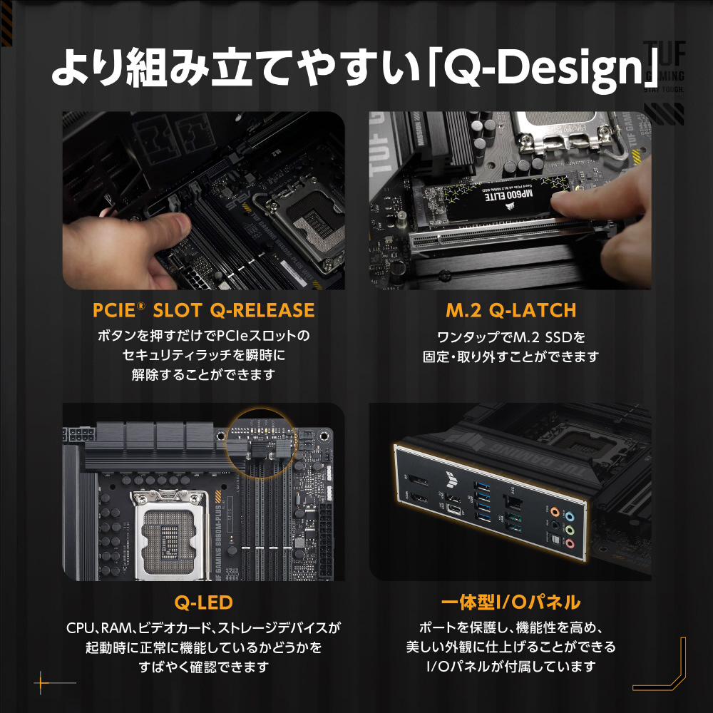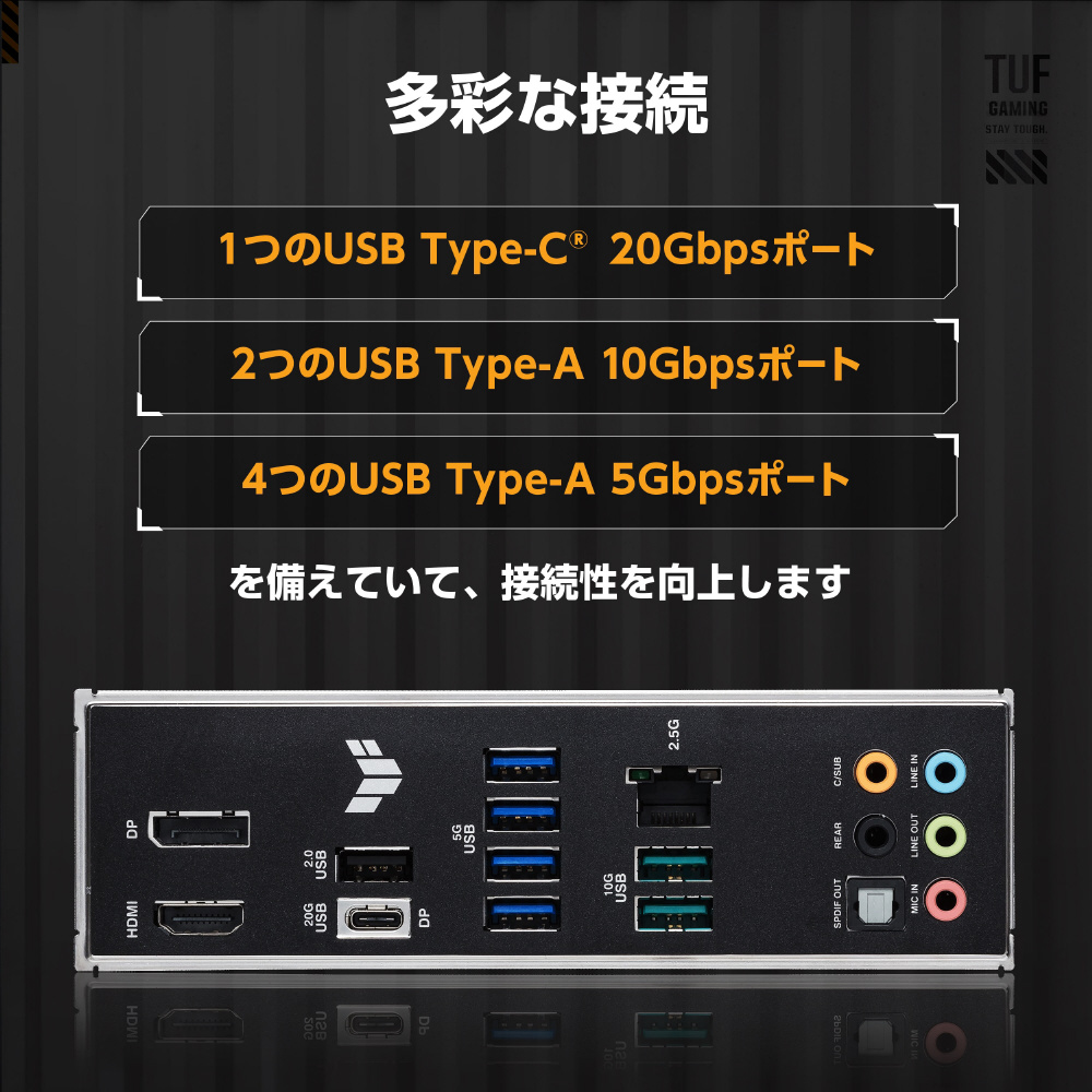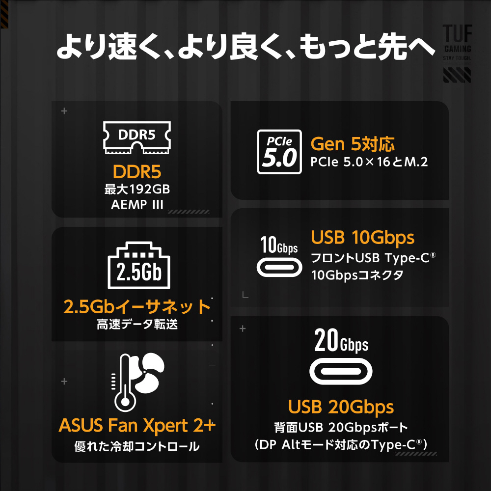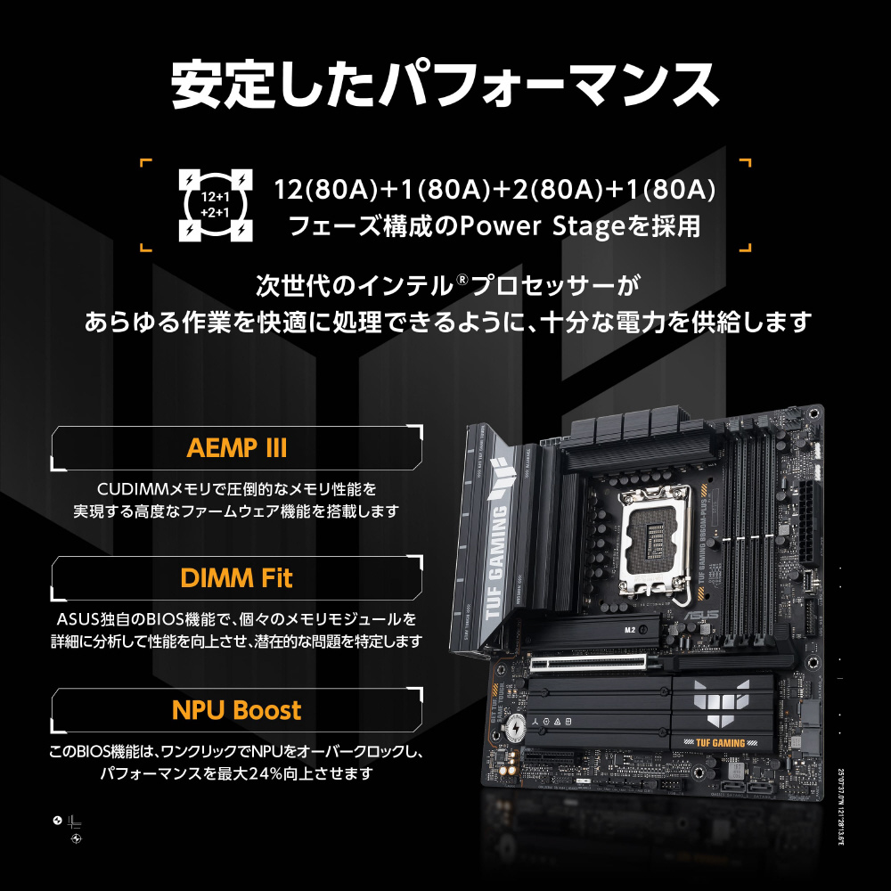 ASUS TUF GAMING B860M-PLUSは、最新のインテル Core Ultraプロセッサー(シリーズ2)のすべての重要な要素を取り入れ、ゲームに対応する機能と実証済みの耐久性を兼ね備えています。ミリタリーグレードのコンポーネント、改良された電源ソリューション、包括的な冷却システムを採用したマザーボードは、長時間のゲームでも期待以上の安定したパフォーマンスを発揮します。