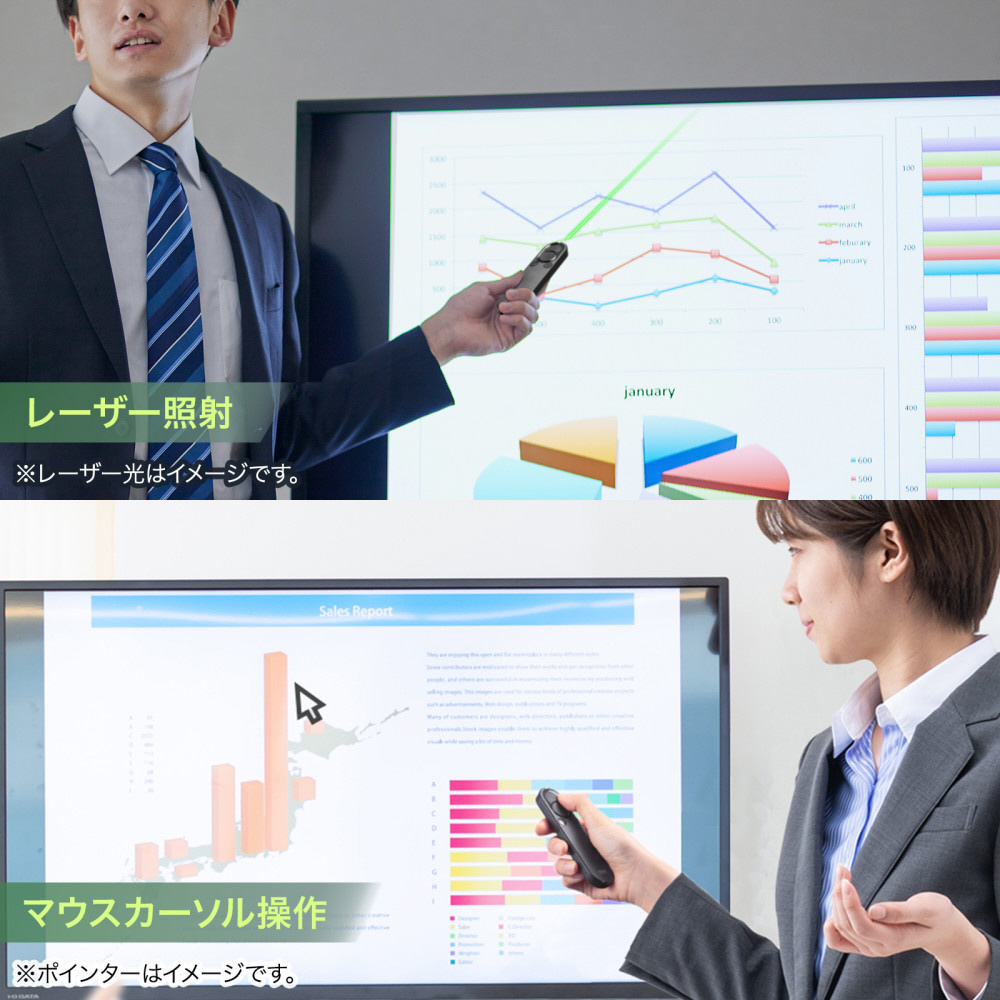 ●レーザー照射とマウスカーソル操作の2通りの使い方ができるレーザーポインターです。