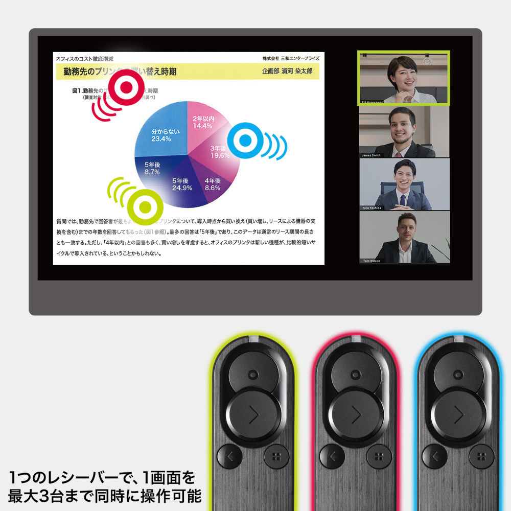 ●1つのレシーバーで最大3台まで同時に操作可能で、複数人でのプレゼンにも対応し、印象に残るプレゼンを演出します。