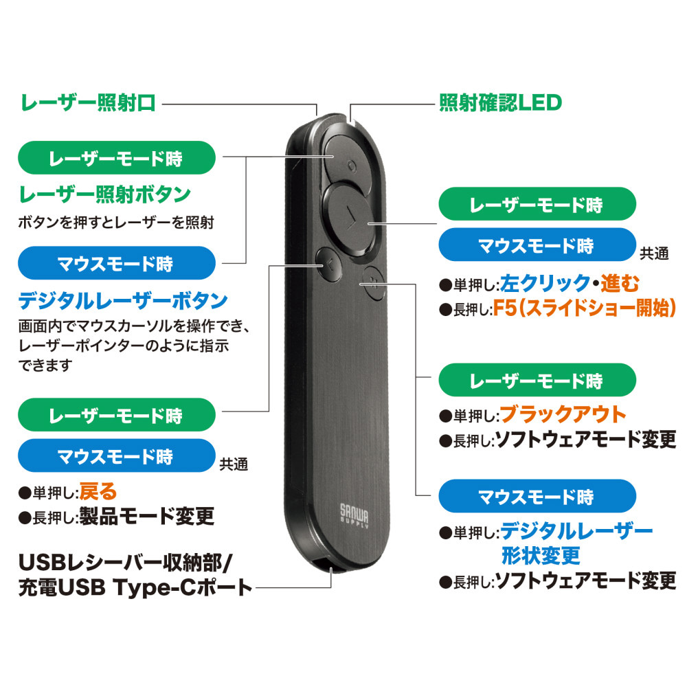 | 商品名 | MA-WPR15BK 2WAYプレゼンター(グリーンレーザー・マウス操作対応) |