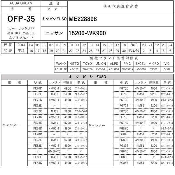 | 商品名 | PLATINUM オイルフィルター ミツビシFUSO・ニッサン車用(代表純正番号:ME228898等) AD-OFP-35 |