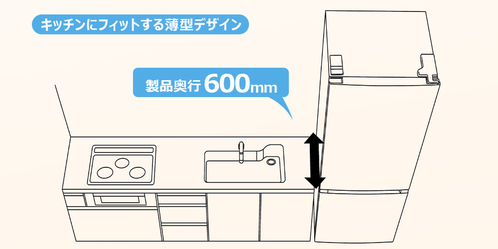 幅600×奥行600mmだからキッチンにフィットする薄型デザイン