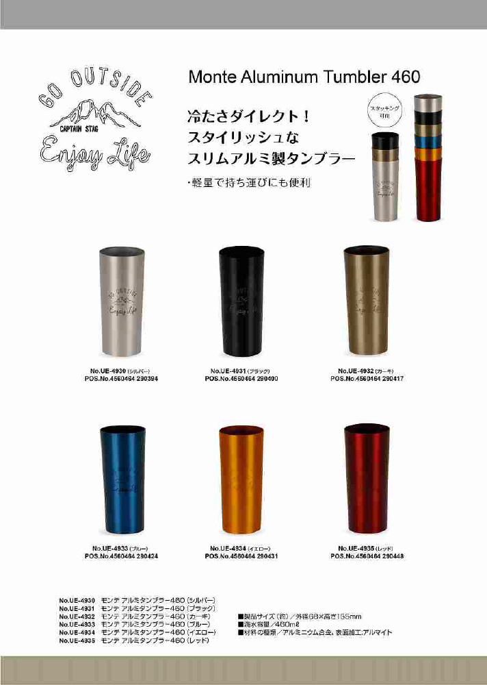 キャプテンスタッグ【モンテ】シリーズ冷たさダイレクト!スタイリッシュなスリムアルミ製タンブラー軽量で持ち運びにも便利。たっぷり飲める460mlサイズ。スタッキング可能。
