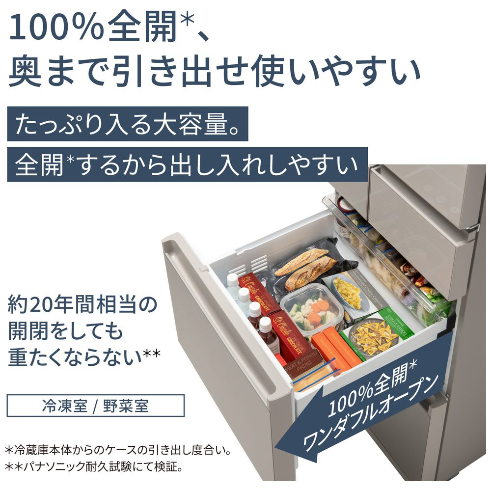 100%全開で奥まで使いやすい&大容量。ラクに全開できるから、奥までしっかり見え、整理しやすい引き出しです。底面が広く、食品もたっぷり入れられます。庫内の収納物を一目で確認できるので、欲しいものをサッと取り出せます。