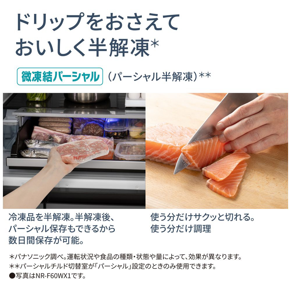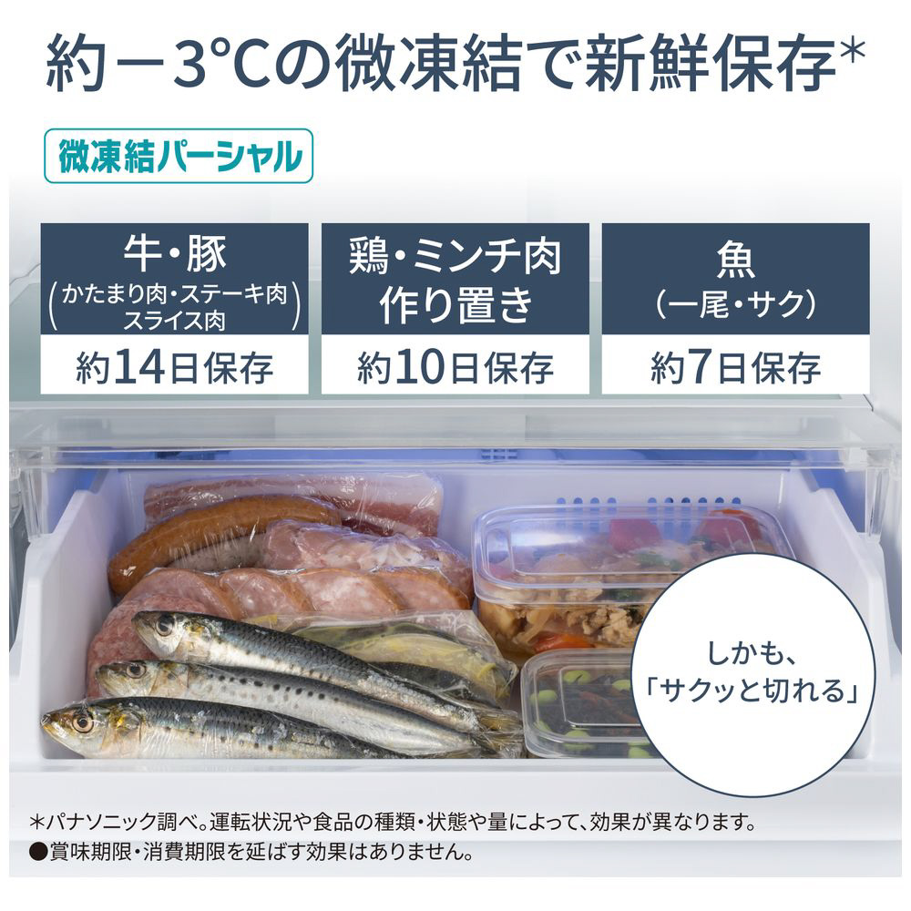 冷凍とチルドの間の約-3℃の微凍結で食材を保存するので、長持ちして、しかも面倒な解凍いらず。冷蔵庫から出して、そのまま魚を切ったり、薄切りのバラ肉をはがしたりなど、使いたい分だけ使えるので、毎日の調理がより手軽にできます。長持ちするから、新鮮においしく食べきれます。