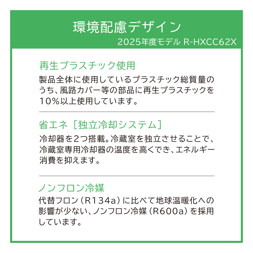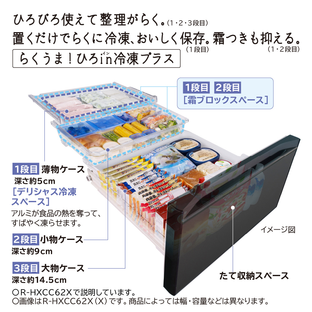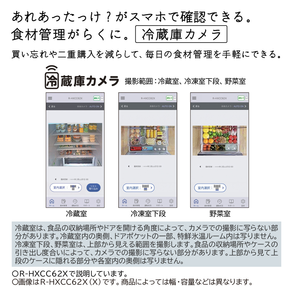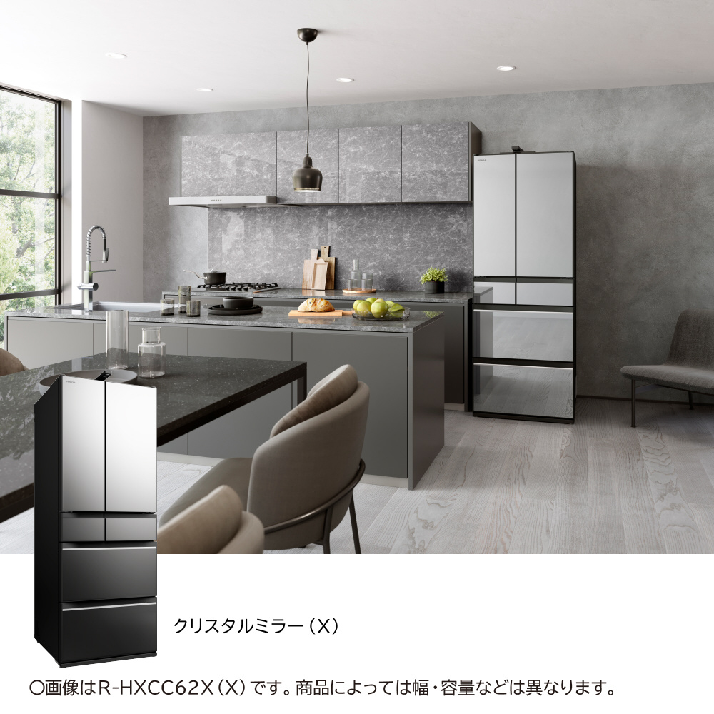 | 商品名 | 冷蔵庫 HXCCタイプ クリスタルミラー R-HXCC62X_X [幅68.5cm /617L /6ドア /観音開きタイプ /2025年] 【基本設置料金セット】 |