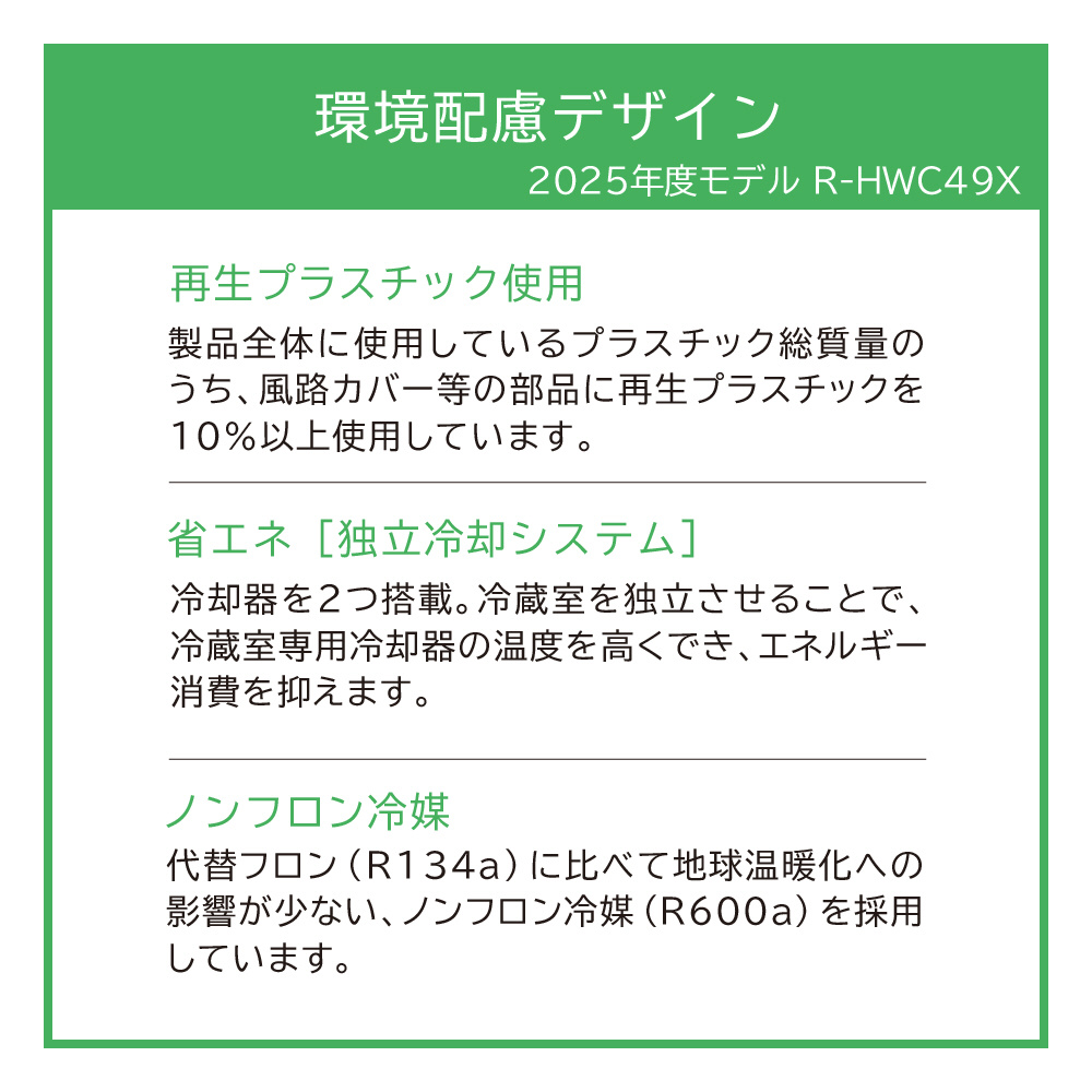 | 商品名 | 冷蔵庫 HWCタイプ ライトゴールド R-HWC49X_N [幅65cm /485L /6ドア /観音開きタイプ /2025年]【基本設置料金セット】 【買い替え10000pt】 |