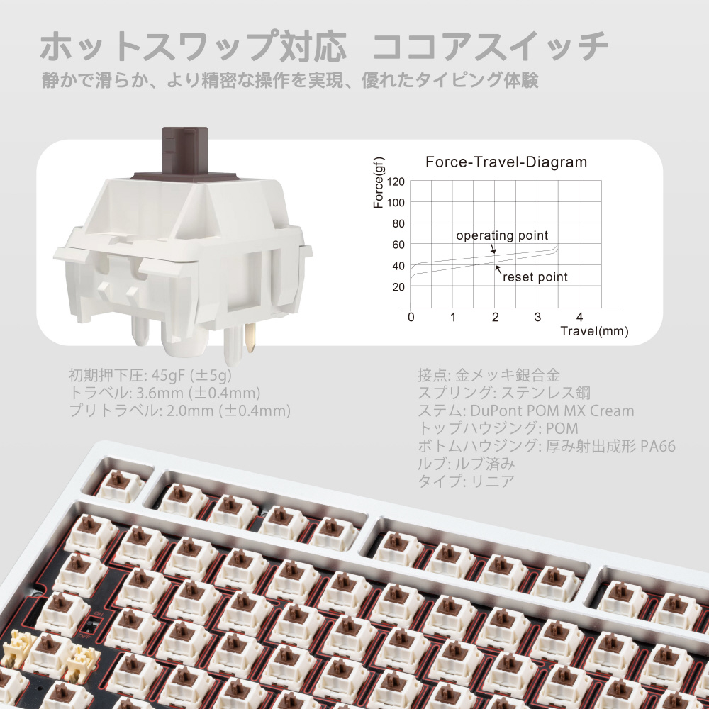 | 仕様3 | [キースイッチ] KAILHココアスイッチ、ルブ済み タイプ:リニア 作動点:2.0±0.4mm ストローク:3.6±0.04mm 初期押下圧:40±5gf スプリング:22mm |