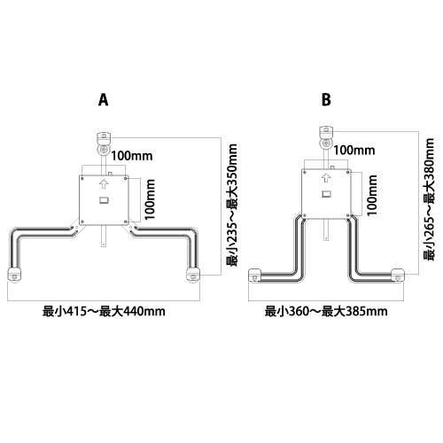 仕様2 | [サイズ (A/Bパターンは取扱説明書を参照)] 下部金具Aパターン取付時: W360または385×D95×H265〜380mm 下部金具Bパターン取付時: W415または440×D95×H235〜350mm [材質]メタル、樹脂、ゴム [内容物] 本体ユニット 下部金具×2 工具 モニターアーム取付用ネジ×4 |