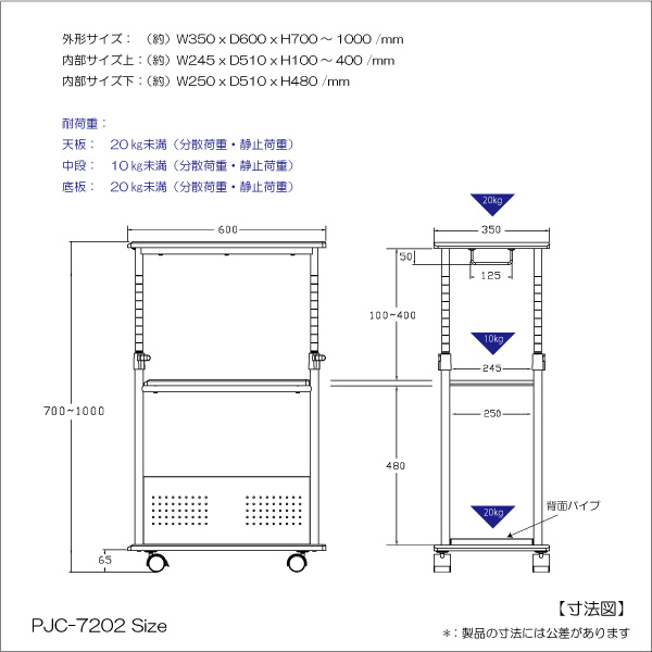 上下昇降パソコンワゴン [W350xD600xH700〜1000mm] 2段式 白木目 PJC-7202-WH