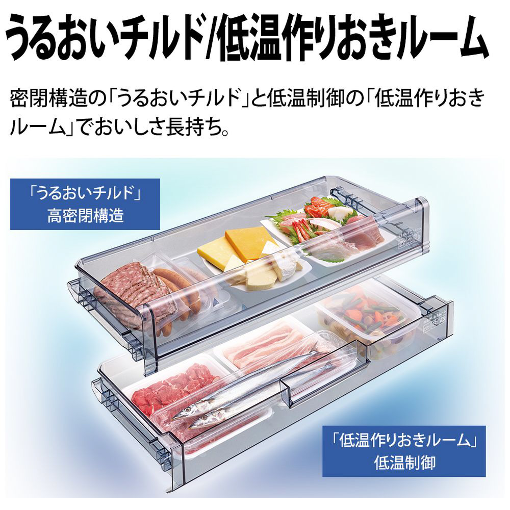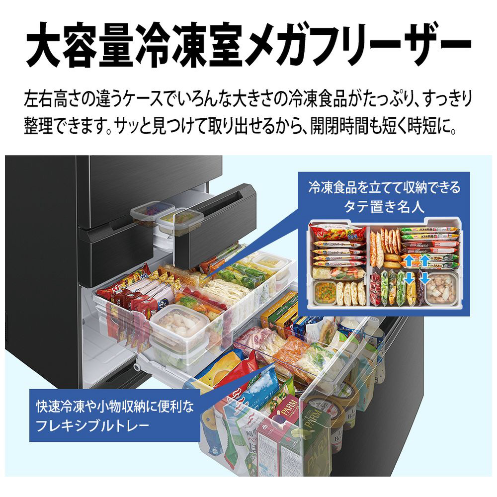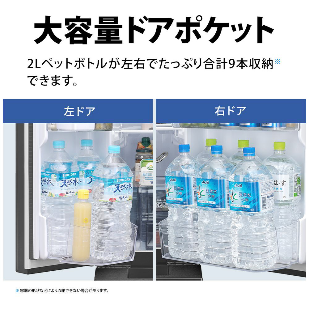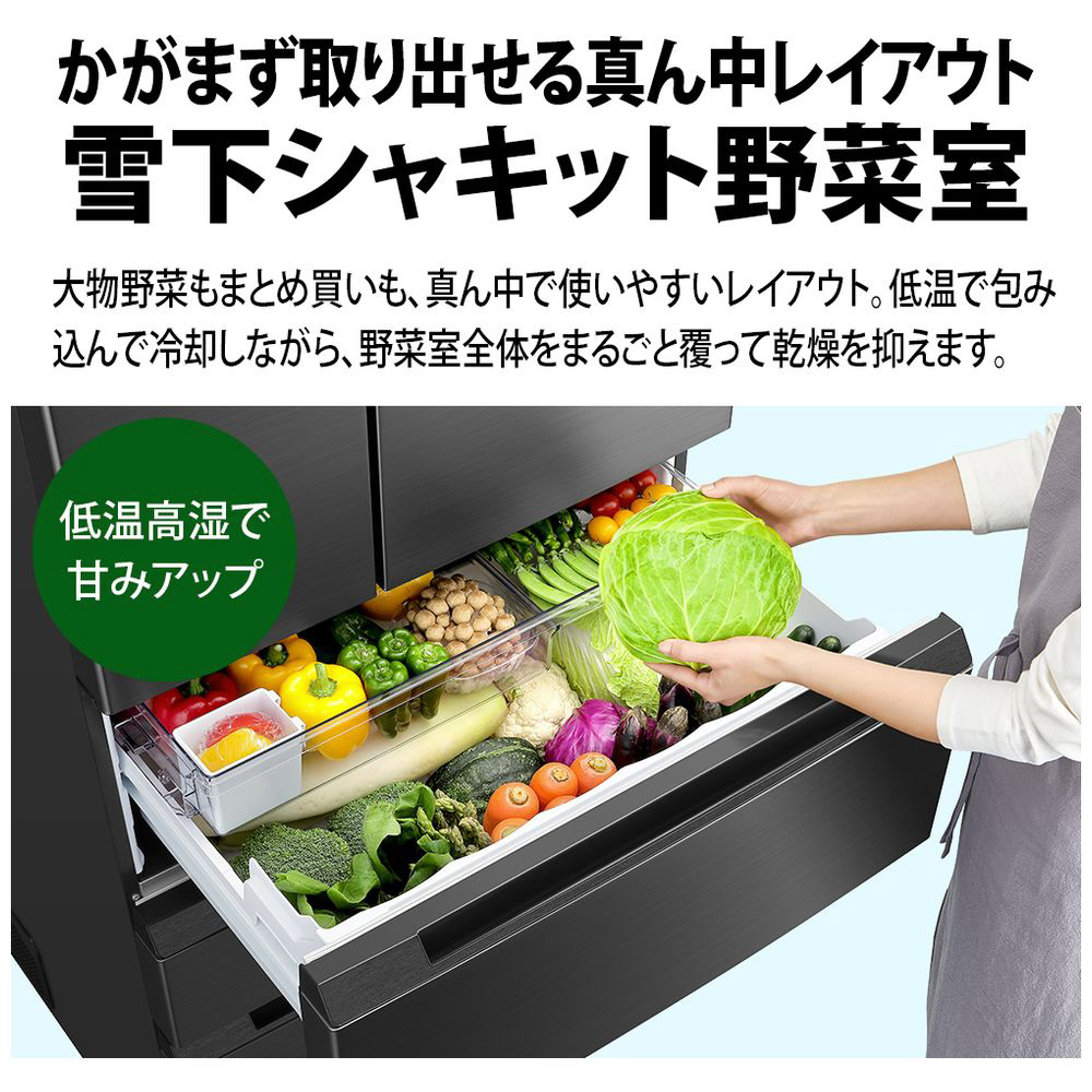 業界トップクラス奥行薄型63cmモデルのプラズマクラスター冷蔵庫。横幅ワイドで庫内が見渡しやすく取り出しやすい。