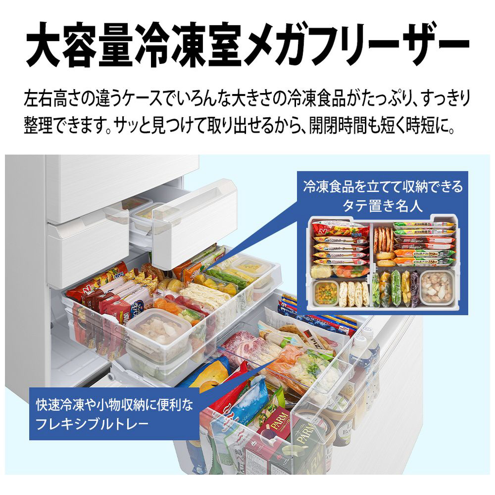 たっぷり入って便利に使える大容量冷凍室のメガフリーザーを搭載。