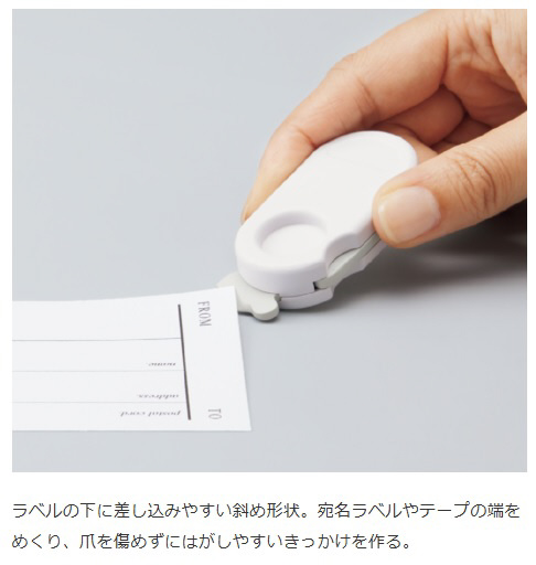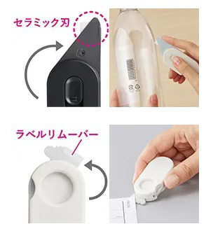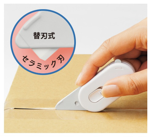 刃はさびにくく切れ味が長持ちするセラミック製。高さを固定することで荷物を傷つけにくく(段ボール厚み5mmを想定)、安心して開梱作業を行えます。本体にはラベルの端をめくりやすいラベルリムーバーも搭載。また、ペットボトルのラベルはがしにも活躍します。