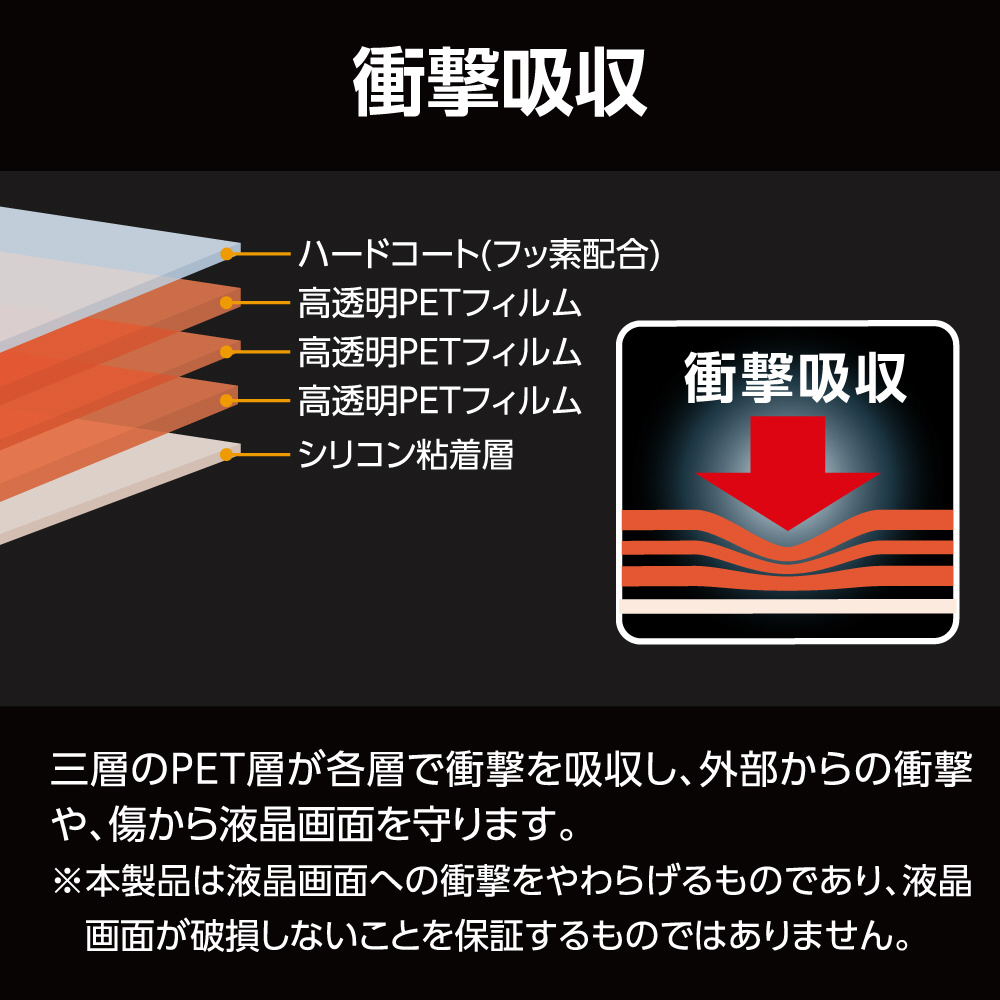 耐ショック・防水モデルに適した「耐衝撃」「撥水」液晶保護フィルム。トリプルPET層が衝撃や傷から液晶画面を守ります。