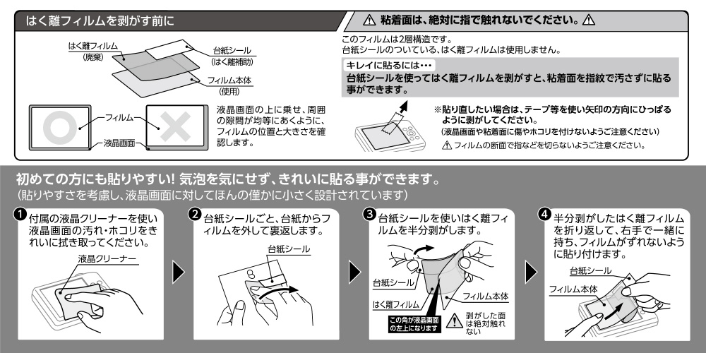 シリコン粘着層の自己吸着性により、フィルムを液晶画面に置くだけで自然に貼りつくため貼り付けが簡単です。