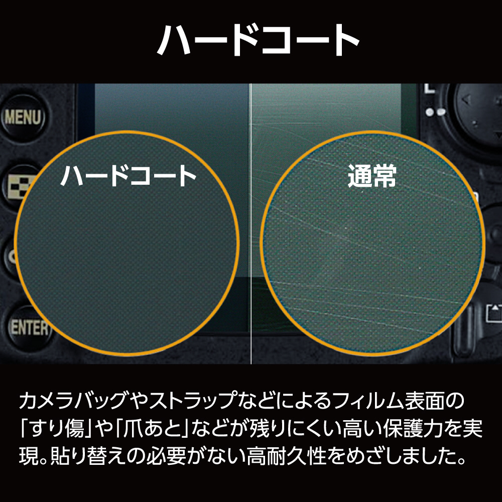 カメラバッグやストラップなどによるフィルム表面の「すり傷」や「爪あと」などが残りにくい、高い保護力を実現。
