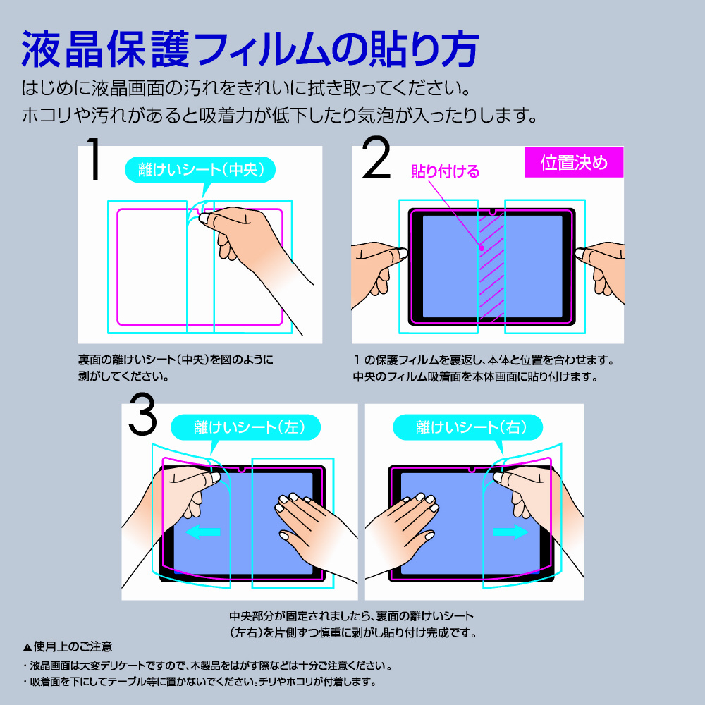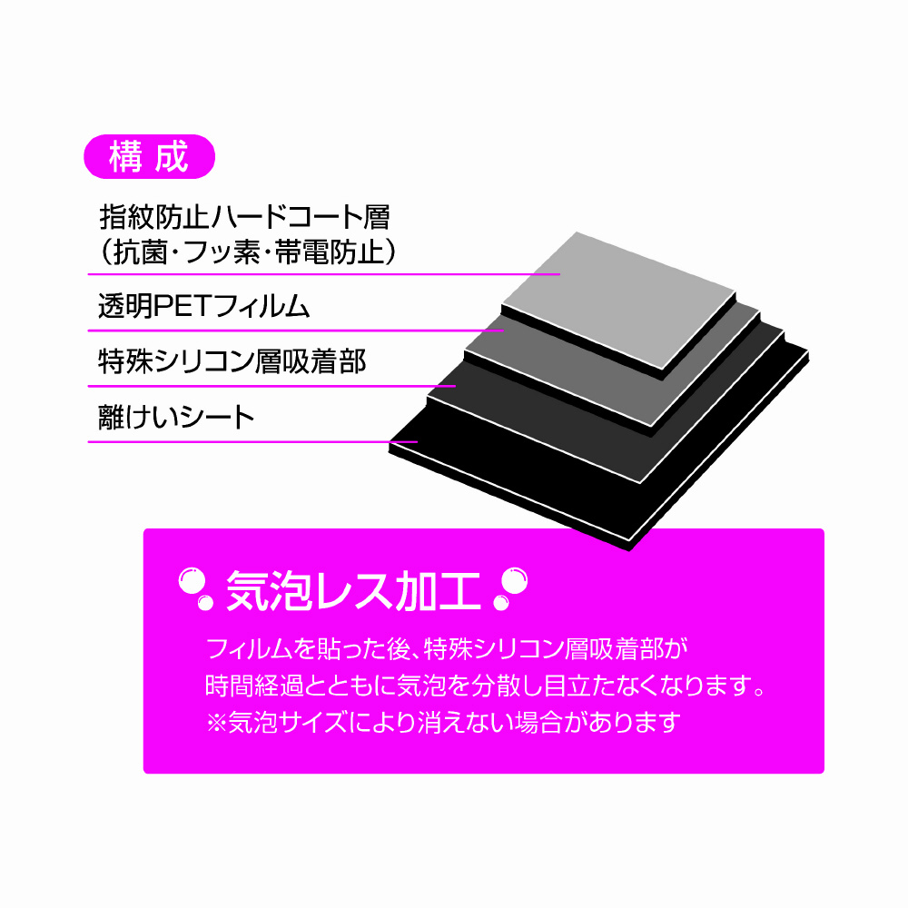 フィルムを貼った後、特殊シリコン製吸着面が、時間経過とともに気泡を分散し目立たなくなります。