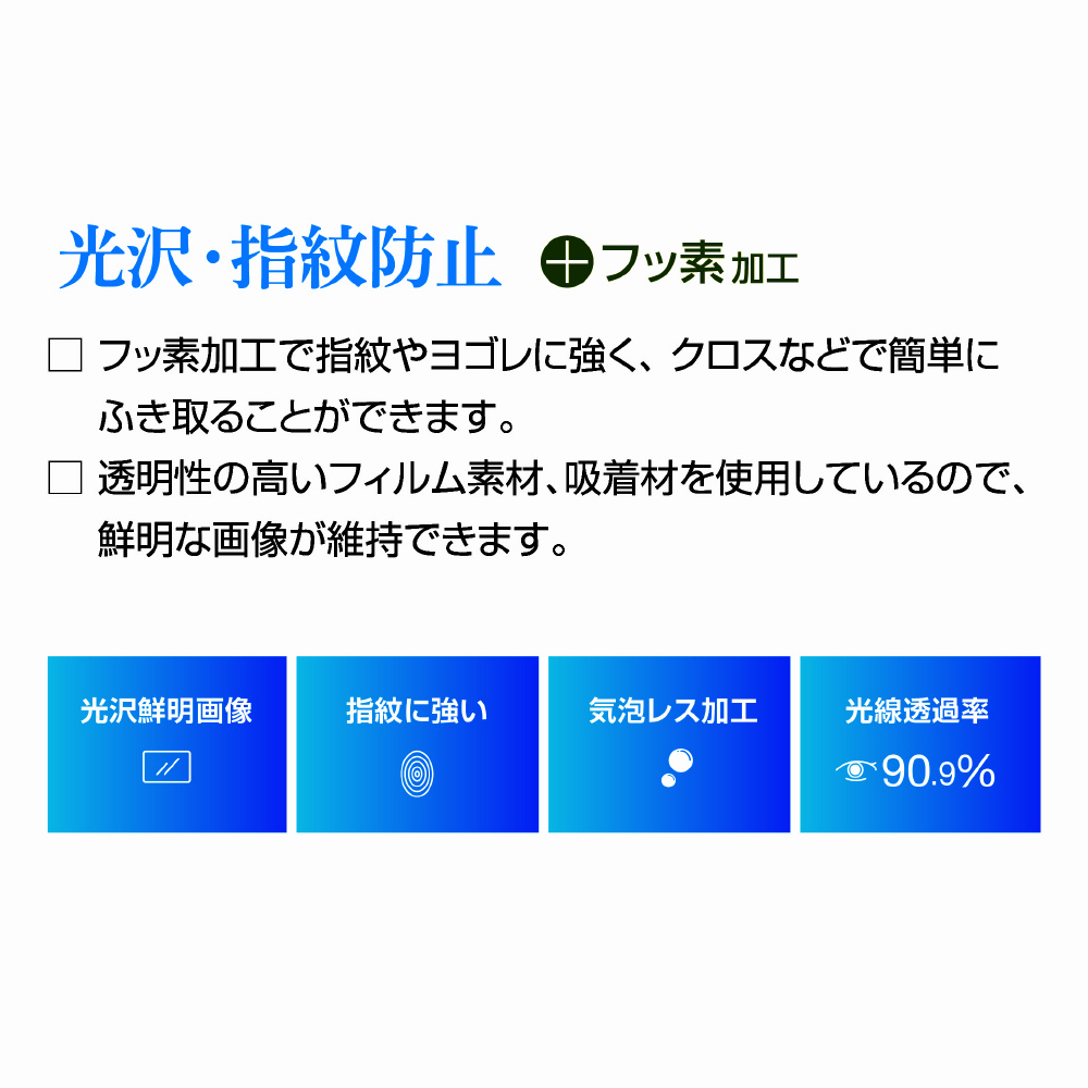 指紋防止加工により汚れを軽減し、抗菌&フッ素加工でタッチパネルに最適な光沢スタンダードタイプ。