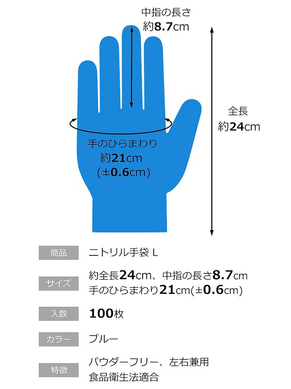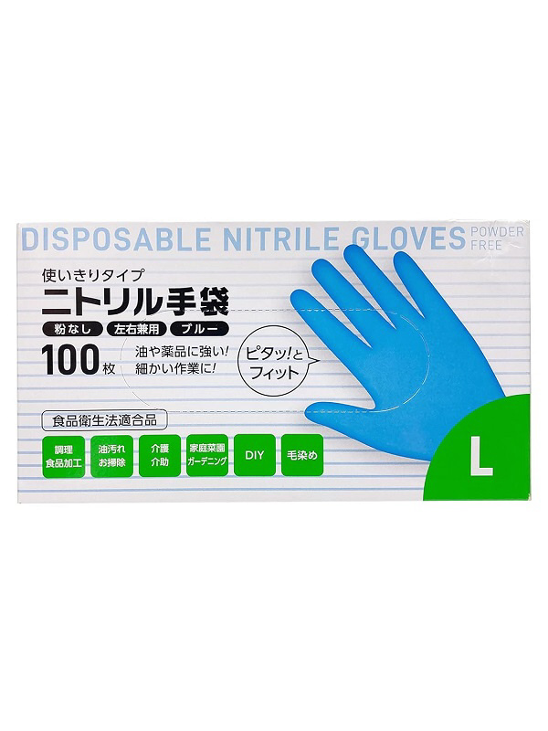 使い捨てニトリル手袋(ブルー、Lサイズ)100枚入り。