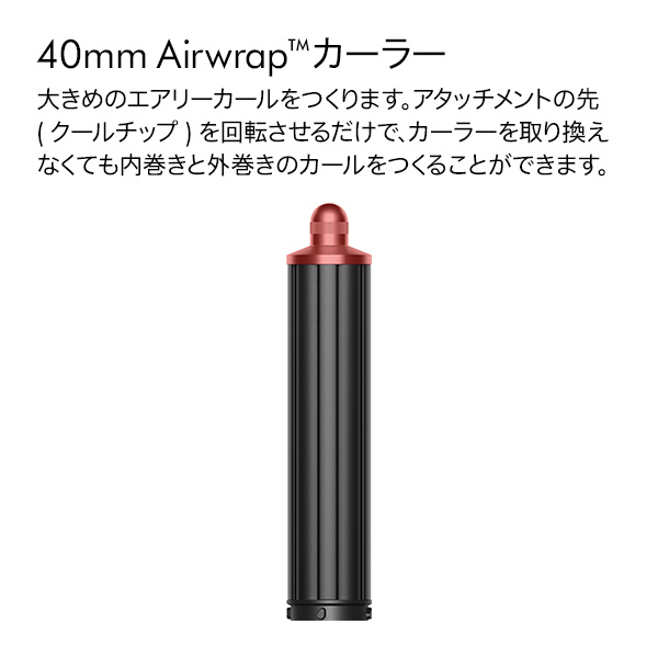 | 付属品 | Conical Airwrapカーラー、40mm Airwrapカーラー、スムージングブラシ(ソフト)、スムージングドライヤー、収納バッグ、フィルタークリーニングブラシ |