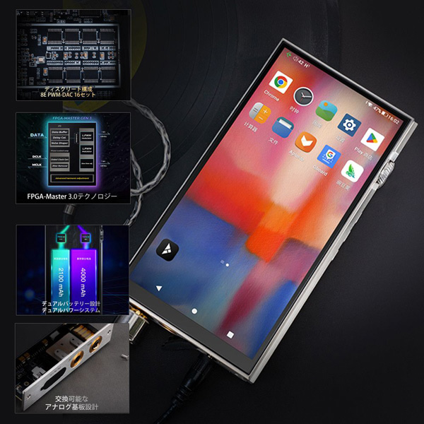 | 仕様1 | ●ディスプレイ:6.0インチAMOLED(1080×2160インセル静電容量式タッチスクリーン) ●DAC:独自開発ディスクリートPWM-DAC回路 ●対応サンプリングレート:PCM 32bit/768kHz、Native DSD512 ●USB-DAC時対応サンプリングレート(No Driver):PCM 32bit/384kHz、DSD128 ●USB-DAC時対応サンプリングレート(ASIO):PCM 32bit/768kHz、DSD512 ●オーディオフォーマット:APE、FLAC、WAV、WMA、ACC、ALAC、AIFF、OGG、M |