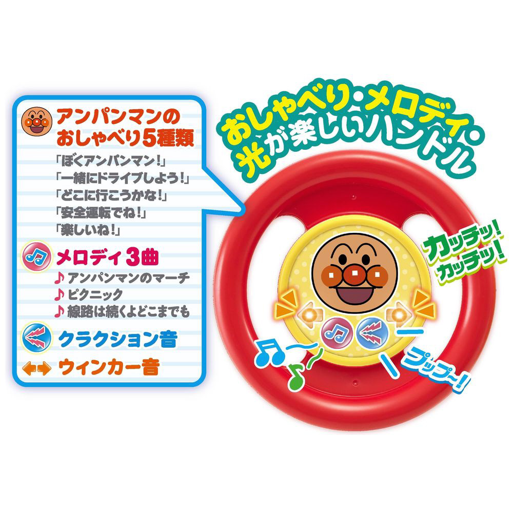 ■ハンドルには5種類のアンパンマンのおしゃべり、3曲のメロディ、クラクション、光るウィンカーがついています。