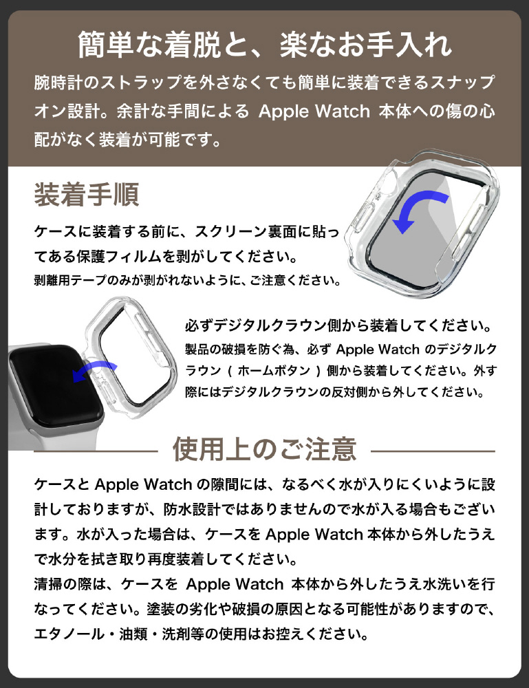 Apple Watch画面の曲面にまで正確にフィットするガラススクリーンは、Apple Watchの画面を最大限かつ超鮮明に表示させ、高いタッチ感度を実現しています。