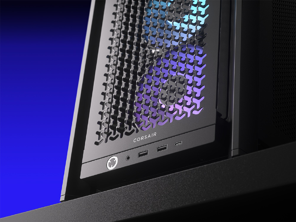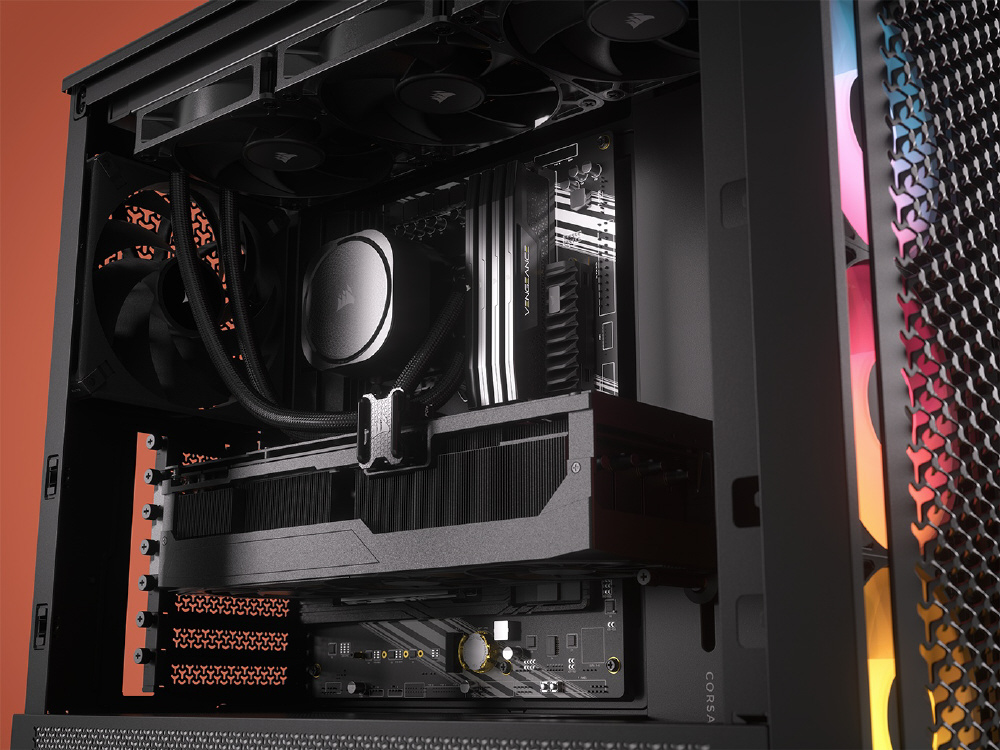 柔軟なファンレイアウトが可能なInfiniRailシステムを搭載。RGBファンを備え、背面コネクタ設計のマザーボードに対応するミドルタワー型PCケース