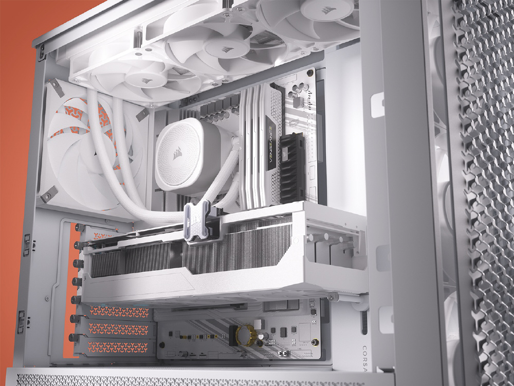 柔軟なファンレイアウトが可能なInfiniRailシステムを搭載。PWMファンを備え、背面コネクタ設計のマザーボードに対応するミドルタワー型PCケース