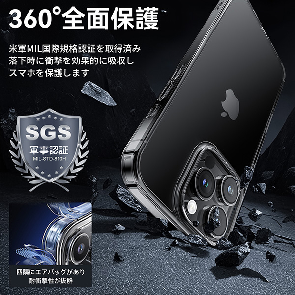 MIL-STD-810H認証取得。ケースと高透明ガラスフィルムがセットになっている商品です。背面カメラ部分を保護するため1mm高いエッジ構造となっています。ワイヤレス充電対応。