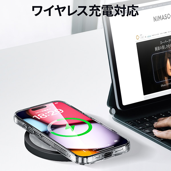 ケースと高透明ガラスフィルムがセットになっている商品です。背面部分はレンズ周辺もカバーする構造となっています。ワイヤレス充電対応。