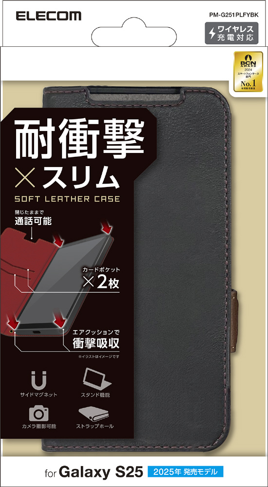 | 商品名 | Galaxy S25(SC-51F)/レザーケース/手帳型/ステッチ/耐衝撃/磁石付き ブラック PM-G251PLFYBK |